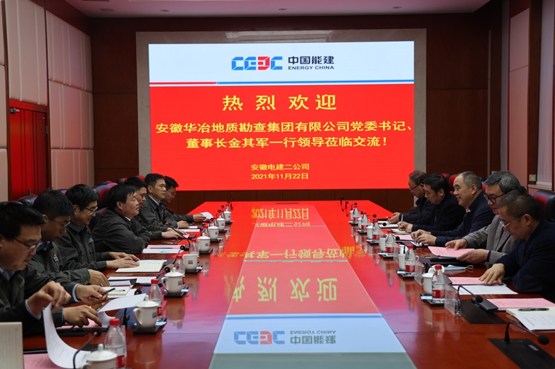 陳建明董事長(zhǎng)對(duì)金其軍董事長(zhǎng)一行的到訪表示歡迎,簡(jiǎn)要介紹了中國(guó)能建安徽電建二公司歷史沿革、業(yè)務(wù)布局、工程建設(shè)及近年來(lái)的生產(chǎn)經(jīng)營(yíng)發(fā)展情況。他表示中國(guó)能建安徽電建二公司與華冶地勘集團(tuán)合作前景非常廣闊,希望雙方在基礎(chǔ)工程勘察、新能源開(kāi)發(fā)利用、地下空間探測(cè)、礦業(yè)投資及開(kāi)發(fā)等領(lǐng)域進(jìn)一步加強(qiáng)溝通對(duì)接、深化交流合作,攜手實(shí)現(xiàn)互利共贏、協(xié)同發(fā)展。